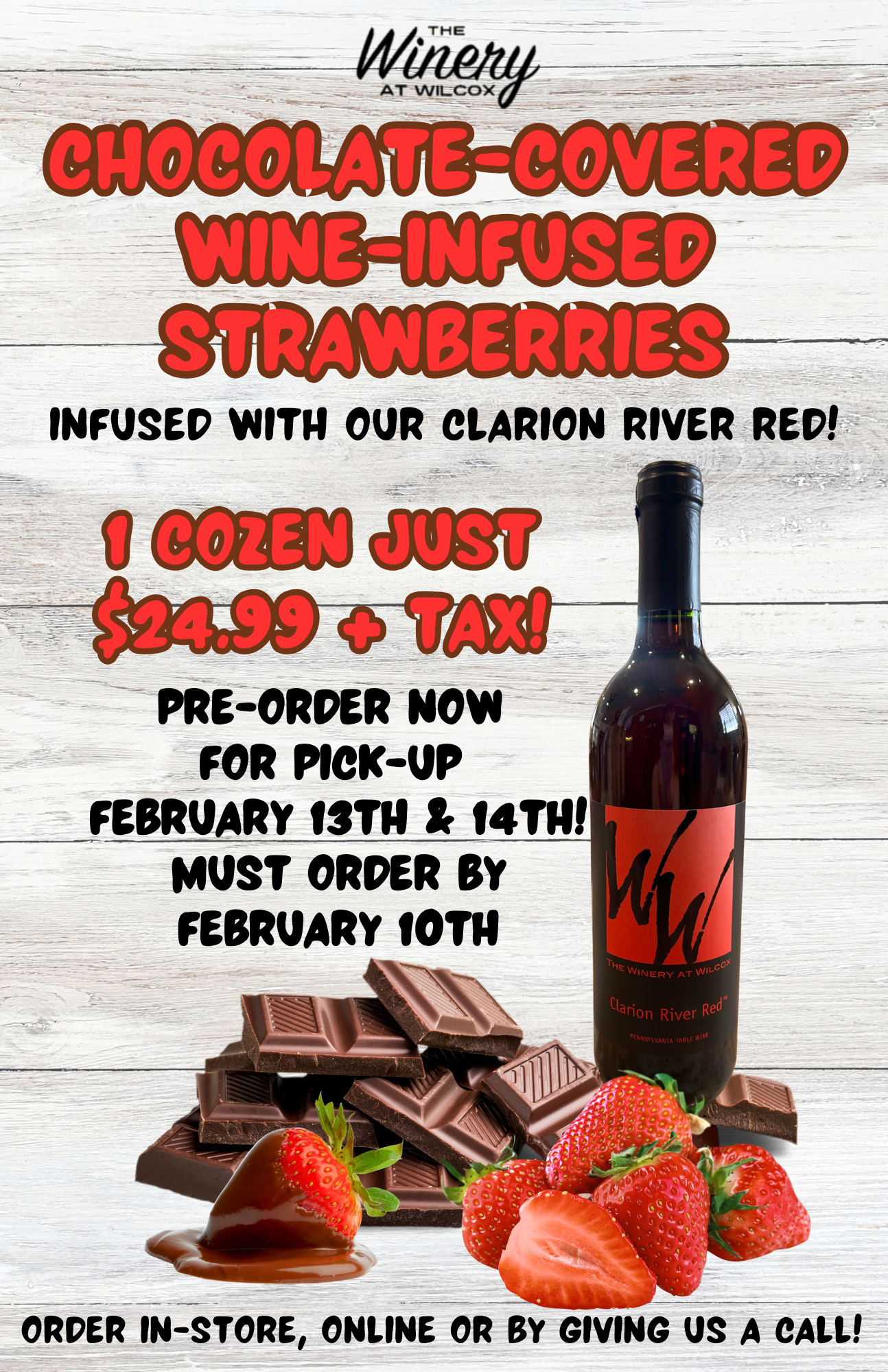 Pre-orders are now open for our delicious wine-infused chocolate-covered strawberries! They will be infused with our Clarion River Red for just $24.99 plus tax per dozen!